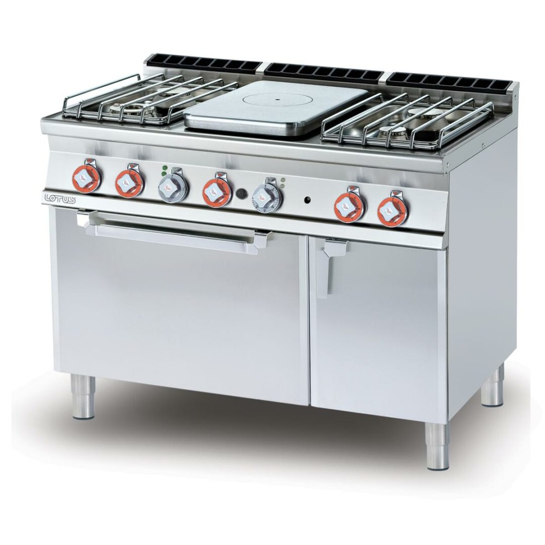SUD CHR spécialisé dans le matériel de cuisine professionnelle vous propose ce Fourneau gaz 4 feux + plaque coup de feu four gaz GN2/1 et placard neutre -PROFONDEUR 700- LOTUS