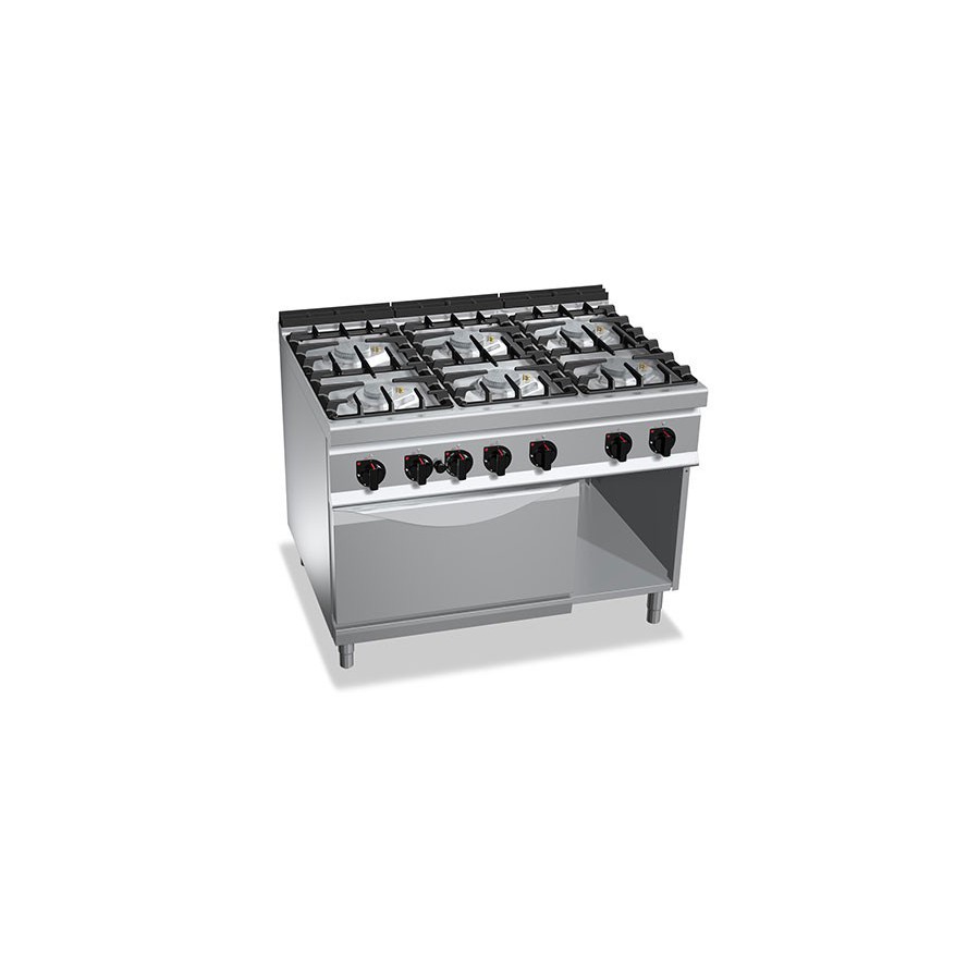 Cuisinière gaz 6 brûleurs puissants (48kW) sur four gaz puissant (7.8kW) et compartiment neutre