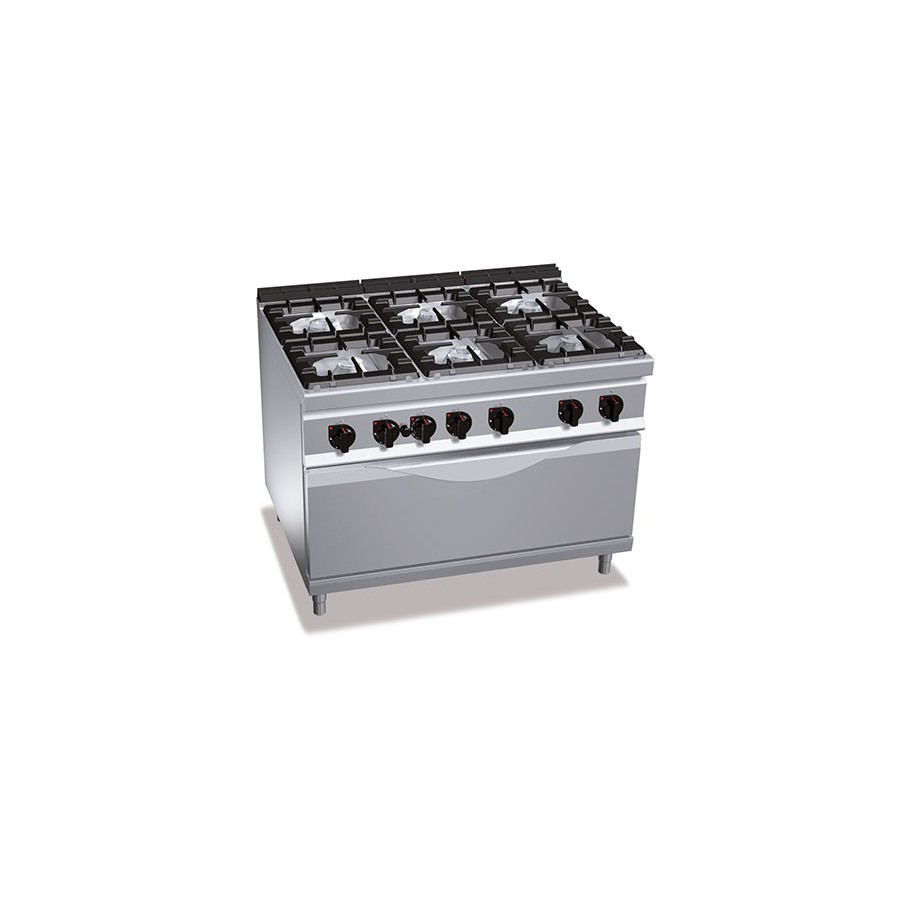 Cuisinière gaz 6 brûleurs surpuissants (53.5kW) sur four gaz puissant (12kW)