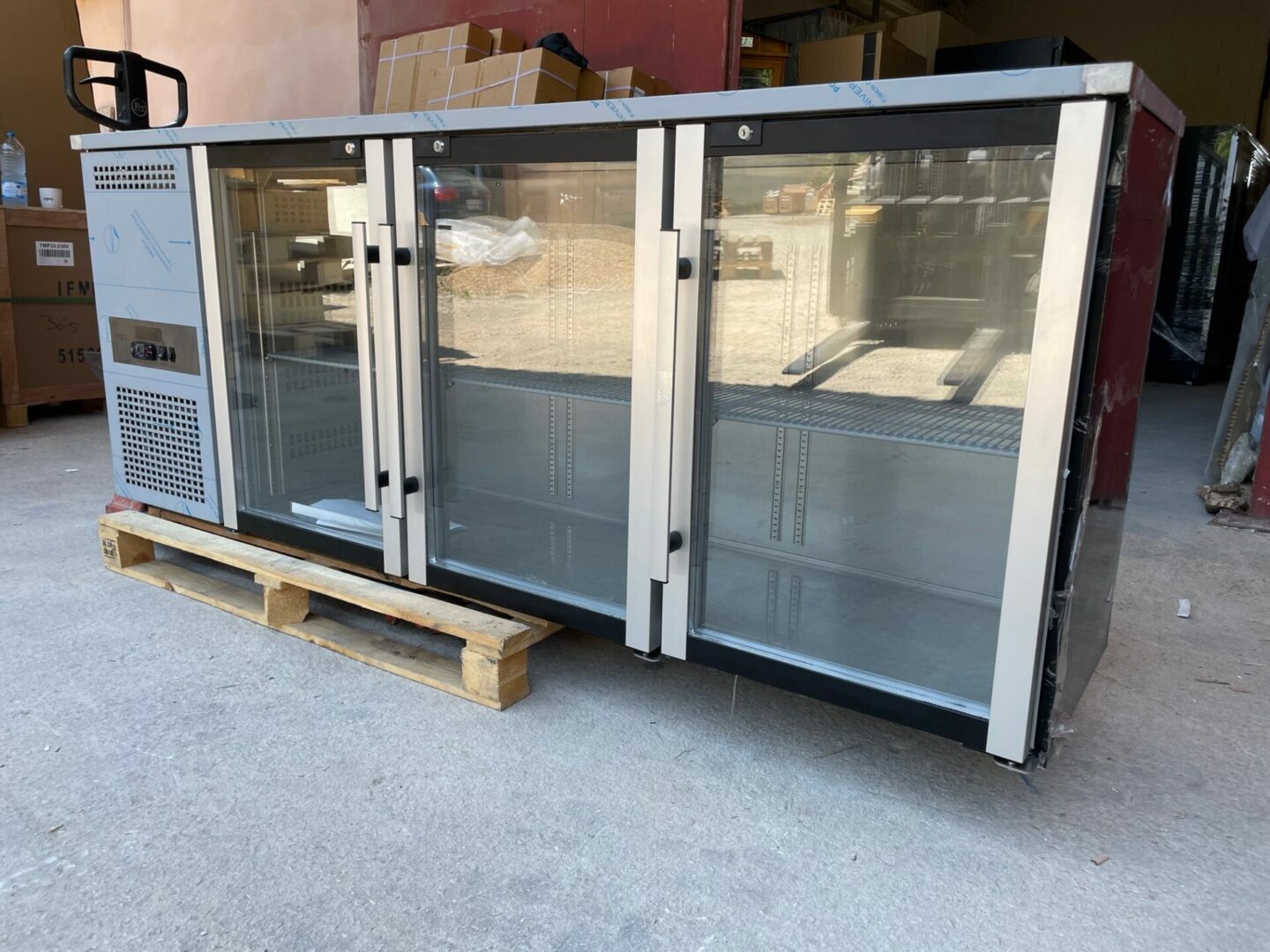 Cet arrière-bar réfrigéré professionnel est équipé de 3 portes vitrées et d’un éclairage interne.
