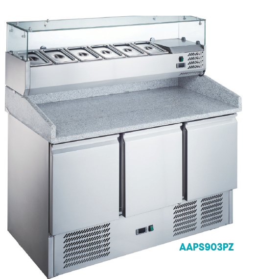 Sud CHR, votre référence en matériel professionnel de cuisine vous propose ce tour réfrigéré de pizzeria. Ce Meuble à pizza 3 portes vitré vous promet performance et ergonomie. Très fonctionnel, il vous permettra le stockage de marchandises périssables, grâce à son espace de stockage réfrigéré de 368 Litres ainsi que la préparation de vos pizza grâce à son plan de travail en granit et aux 6 emplacements pour bacs GN. Pensé et conçu pour les pizzaiolos, il sera un allié de premier choix pour votre pizzéria.