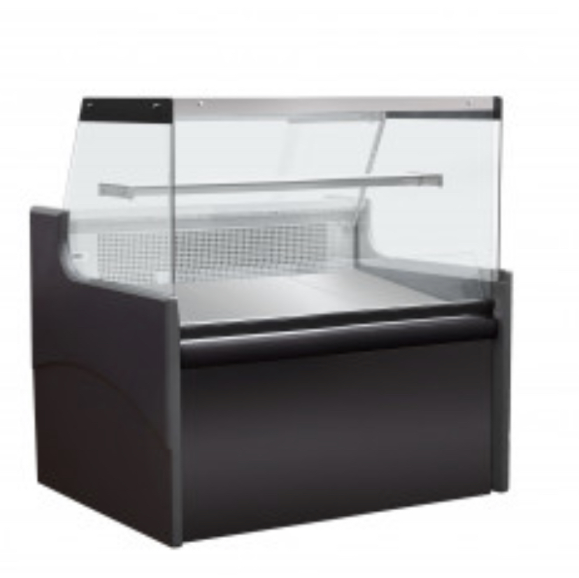 - Vitrine de presentation produits vitre droite , avec reserve de stockage , tablette de service arrière en granit , éclairage LED , vitre coulissante arrière